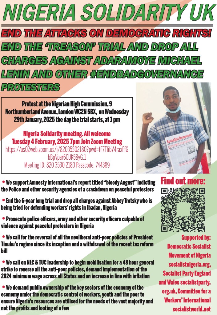 Recall that in the early hours of August 5, 2024, Adaramoye Michael Lenin and a few others were abducted and remanded in detention. It took serious local and international campaign by socialists, activists and trade unions before they were granted bail after almost two months in detention. The campaign to demand the dropping of charges and an end to the trial and victimisation must now be intensified. We call on you all – particularly diasporans, socialist groups and trade union activists – to join this campaign to demand an end to attack on democratic rights of working people in Nigeria.